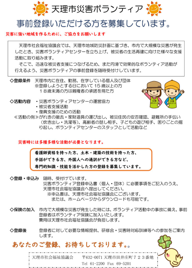 天理市災害対策本部が設置される大規模な災害が発生した際などに、ボランティアとして救援活動しようとする方・団体の事前登録を行います。